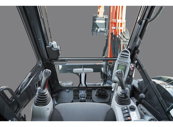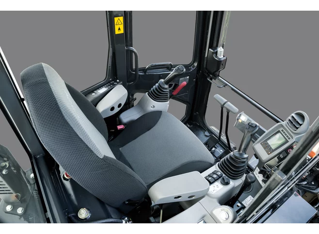 Die geräumige Kabine (größer als bei kleineren Modellen) bietet hervorragende Sicht, ein ergonomisches Design und ist auf Wunsch mit Klimaanlage ausgestattet. Die feinfühlige Joystick-Steuerung garantiert ermüdungsfreies und präzises Arbeiten.